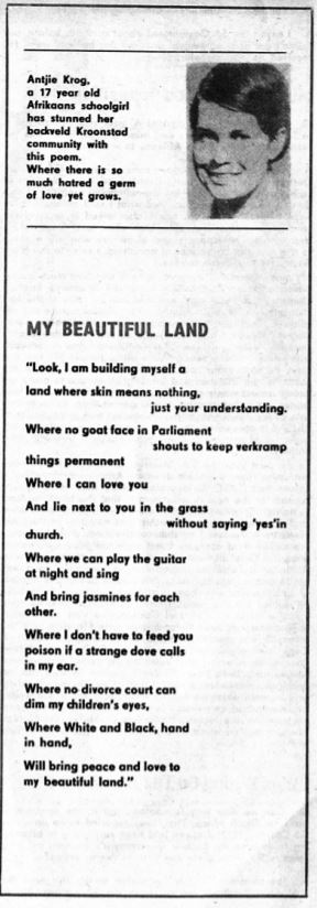 AK: Of course you are right. I wrote ‘My Mooi Land’ [‘My Beautiful/Pretty Land/Country’] and was completely thrown to learn that it was read on Robben Island and that the political inmates said: If an Afrikaner girl is saying this, we will be free in our life time. So yes, in terms of ‘changing’ things, the very first poems perhaps already did that. But at the same time it was a kind of easy attack on one’s own people, with hardly any knowledge of who it was that one was reaching out to. One became aware of the absence, the not-knowing, then of the anger, the real murderous intent and black writers asking: where are the Afrikaner writers when the country is burning?