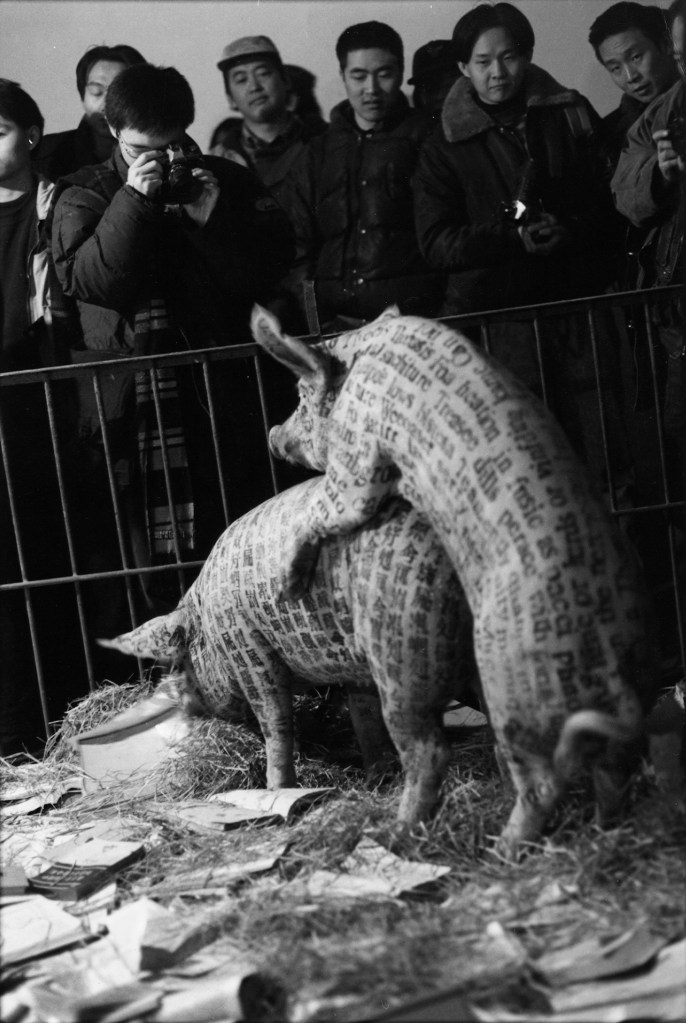 1.1 As the photograph above intimates, this created an intricate play of perspectives as well as an element of unpredictability. While monoliterate spectators at the Han Mo Arts Center in 1990s Beijing might have contrasted the evidently asemic Chinese characters on one pig with the potentially legible English (?) words on the other, those able to read both scripts might have made more of the difference between the nonsensical characters on the ink-stamped pigs and the legible print in the books. Yet, as the expressions on the spectators’ faces suggest — read them as you will — the real, challengingly Zen-inspired contrast in this performance piece is between the world of awkward (?), embarrassed (?), puzzled (?), meaning-seeking (?) human beings and other, less conceptually and ethically troubled forms of warm-blooded life. As Xu Bing commented of the pigs: