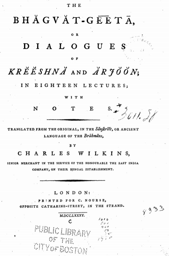 3. Thoreau was not exactly ‘bathing’ in ‘the Gita.’ He was reading Charles Wilkins’s 1785 English translation entitled the Bhagvat-geeta, or Dialogues of Kreeshna and Arjoon, the first full rendering of the Sanskrit original into a European language. Tellingly, in his translator’s preface, Wilkins framed the dialogue between Krishna and Arjuna (in modern spelling), which is ostensibly about war, as an argument against the polytheism of the even more ancient Vedas in favour of what he called the ‘unity of the Godhead’ (24). ‘The most learned Brahmans of the present time,’ he adds, ‘are Unitarians according to the doctrines of Kreeshna’ (24). This made his ‘Geeta’ less alien for English readers versed in the Christian tradition, especially those, like Thoreau’s mentor Ralph Waldo Emerson, who played a leading part in the Unitarian movement that emerged in New England in the late-18th century — the copy of the Wilkins Gita Thoreau read at Walden in fact belonged to Emerson.