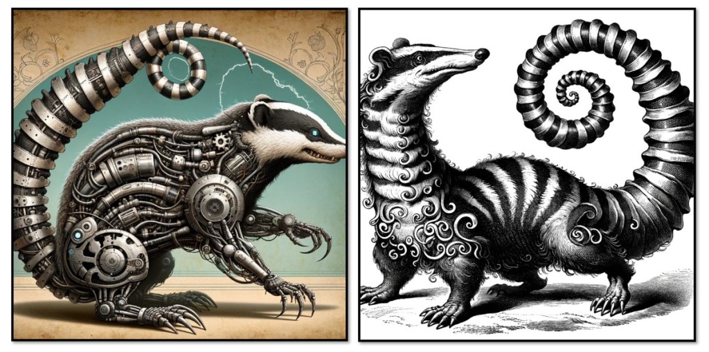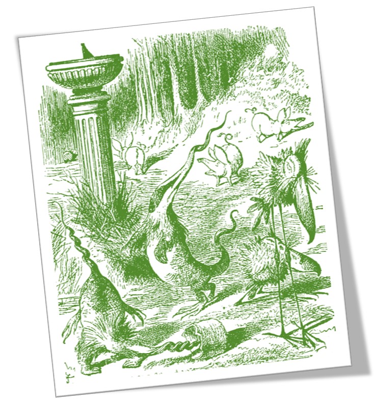 5. Humpty Dumpty glosses particular words from the first verse, revisiting the mock-philological explanations Carroll added to the original 1855 version (see below). Some are informatively and plausibly linguistic: ‘slithy’, for instance, is a ‘portmanteau’ made of ‘lithe and slimy’ (both of Germanic origin). Others are patently guesswork, even though they highlight some of the odd gaps between spoken vs. written English, as in ‘mome’ which is allegedly short for ‘from home’ (again both Germanic). In many cases, however, Humpty Dumpty simply resorts to stipulative definition, re-affirming his megaegomaniacal philosophy of language (Carroll’s satirical (self)portrait of Charles Dodgson?). So ‘toves,’ who ‘make nests under sundials’ and ‘live on cheese,’ are, according to the learned critic, ‘something like badgers—they’re something like lizards—and they’re something like corkscrews.’ John Tenniel, Carroll’s ingenious British illustrator, went with this, permanently fixing Humpty Dumpty’s stipulative image of the toves as strange, post-Darwinian hybrids (they were just a species of badger in Carroll’s original gloss). That still left the problem of pronunciation, at least until Carroll issued instructions in the preface to The Hunting of the Snark (1876): ‘“toves” is pronounced so as to rhyme with “groves’” (so tohvs or /təʊvs/), he insisted with Humpty-ish assurance. The preface also endorses his notorious ego-egg’s idea of the portmanteau.