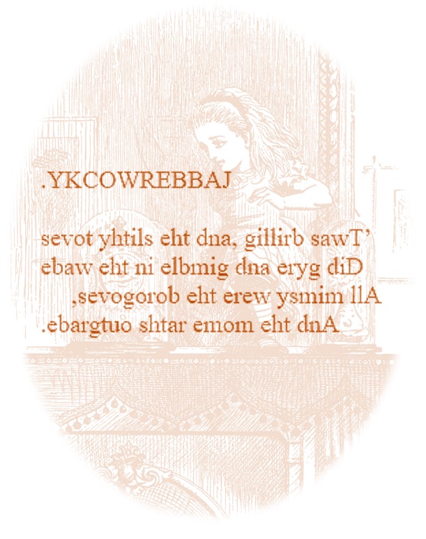 4. Encountering ‘Jabberwocky’ not as a free-floating poem but as an integral part of Through the Looking-Glass (1871) is a very different experience. For one thing, when we first see it in Chapter 1 we look through Alice’s 7½ year-old eyes—worth noting she is at a key stage in her development as a reader, no longer a novice but not yet a fluent comprehender. Though she quickly cracks the mirror ‘code’ in which the poem is written—through the looking-glass toves reads sevot—she ends up grasping only a rough sense of the basic narrative: ‘Somehow it seems to fill my head with ideas—only I don’t exactly know what they are! However, somebody killed something: that’s clear, at any rate—’. She returns to the poem in Chapter 6, now as a perplexed reader seeking enlightenment from Humpty Dumpty. Besides being a riddle (answer: egg) borrowed from an eighteenth-century nursery rhyme, Humpty Dumpty is the mirror-world’s most surreal logician, chief grammarian, and its most imperious literary critic. ‘I can explain all the poems that were ever invented’, he tells Alice with characteristic bravado when she brings up ‘Jabberwocky’, ‘and a good many that haven’t been invented just yet.’