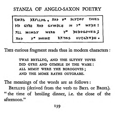 3. Reduced to a simple statement—‘The slithy toves gyre and gimble in the wabe’—Carroll’s initial sentence, the first version of which was a parody of Anglo-Saxon poetry he wrote in 1855 aged 23 (see above and below), anticipates the nonce-formulations beloved of early 20th-century philosophers. Andrew Ingraham, the American educationalist and accomplished philosophical dabbler, produced ‘The gostak distims the doshes’ (p. 154) in 1903, and Rudolf Carnap, the leading logical positivist and member of the Vienna Circle, followed with ‘Piroten karulieren elatisch’ in 1934 (trans. ‘Pirots karulize elatically’, p. 2). The philosophical concerns underlying these two sentences were different. Ingraham worried about language’s seductive power to make us ‘go on, not employing words to stand for things, or to call up thoughts in our minds, but to replace things, to be substitutes for thought’ (154). By contrast, Carnap wanted to show that, ‘given an appropriate rule’, all ‘word-languages’ (including Esperanto) can for all their many ‘deficiencies’ be formalized independently of ‘the meaning of words’, ultimately making the kind of ‘logical syntax’ he advocated possible (2). That Carroll’s pseudo-sensical but logically and grammatically acceptable jabberwocky sentence toys with both possibilities was no doubt not lost on the Oxford logician-mathematician Charles Dodgson.