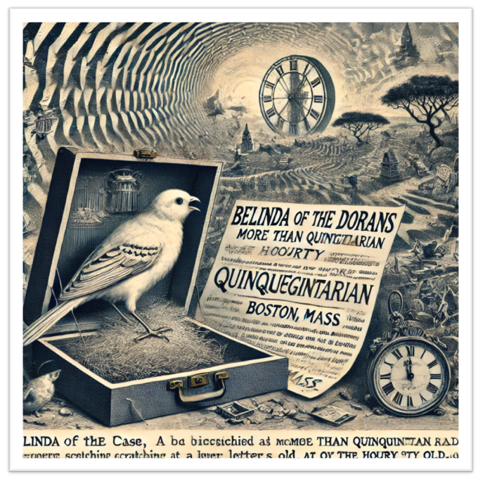 The bird in the case was Belinda of the Dorans, a more than quinquegintarian…and what she was scratching at the hour of klokking twelve looked for all this zogzag world like a goodishsized sheet of letterpaper originating by transhipt from Boston (Mass.) FW, 111