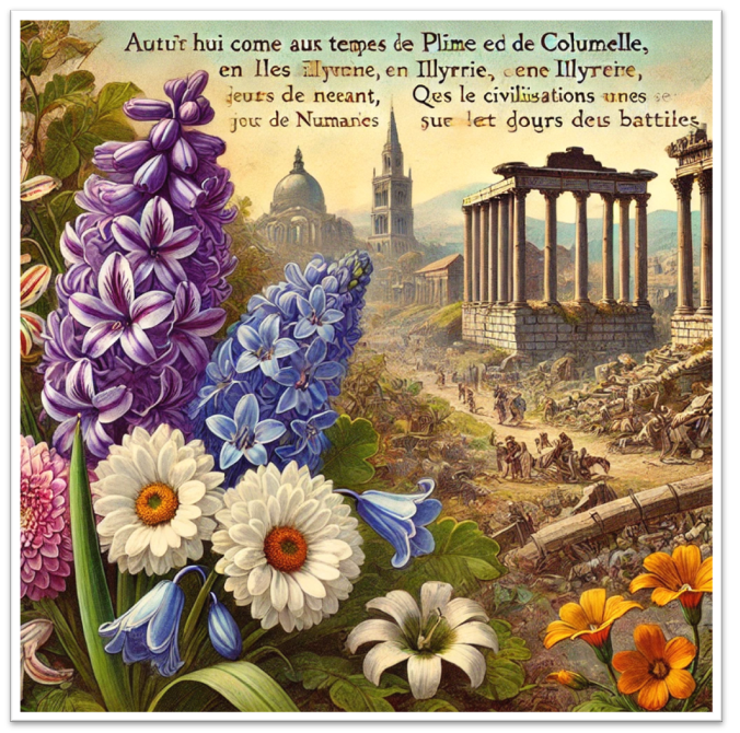 Aujourd’hui comme aux temps de Pline et de Columelle la jacinthe se plaît dans les Gaules, la pervenche en Illyrie, la marguerite sur les ruines de Numance et pendant qu’autour d’elles les villes ont changé de maîtres et de noms, que plusieurs sont entrées dans le néant, que les civilisations se sont choquées et brisées, leurs paisibles générations ont traversé les âges et sont arrivées jusqu’à nous, fraîches et riantes comme aux jours des batailles. FW, 281
