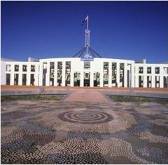 2.4 This image shows the mosaic that forms the forecourt to Australia’s Federal Parliament in Canberra, which was opened in 1988. It is based on a Central Desert dot-style painting, Possum Wallaby Dreaming (1985) by the Aboriginal artist, Michael Nelson Jagamara, who is from the Papunya community in the Northern Territory. According to the Parliament’s website, the architects ‘wanted the Forecourt mosaic, as the first work of art encountered along the north/south Land Axis, to embody the idea of Australia prior to European settlement.’ They also felt that ‘a site-specific work by an Indigenous artist would recognize the unique relationship of Aboriginal cultures with the land.’ In this image the earth-coloured mosaic forms a counterpoint to the loftily air-borne blue flag, which asserts the unity of Australia’s various federating colonies (via the large Federation star), its place in the southern hemisphere (via the five stars of the Southern Cross), and the modern state’s continuing ties to Great Britain/Commonwealth (via the Union Jack).