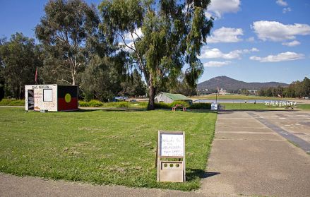2.4.2 In these institutional settings, the Forecourt mosaic and Namok’s painting reflect the evolving efforts on the part of the Australian state, especially since the referendum of 1967, to redress the two-hundred-year-long history of injustice against the many indigenous minority communities by various legal, political and cultural means. Among the most significant landmarks in this history, besides the 1967 referendum, are the Barunga Statement of 1988, the Mabo case of 1992, and Prime Minister Rudd’s apology of 2008. These efforts towards reconciliation have, however, been challenged under the auspices of the Sovereign Union of First Nations and People, which has made sovereignty and self-determination – the watchwords of traditional European state-building – not recognition within the established state structures, the central issue, as the following image shows (note the word-sculpture spelling out ‘SOVEREIGNTY’ on the right):