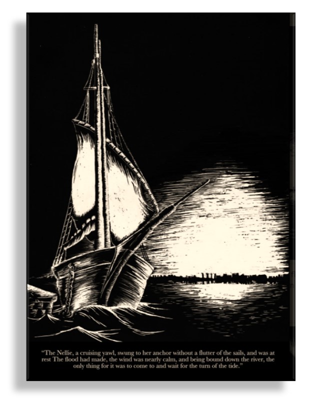 But suddenly, as we struggled round a bend, there would be a glimpse of rush walls, of peaked grass-roofs, a burst of yells, a whirl of black limbs, a mass of hands clapping of feet stamping, of bodies swaying, of eyes rolling, under the droop of heavy and motionless foliage. The steamer toiled along slowly on the edge of a black and incomprehensible frenzy. The prehistoric man was cursing us, praying to us, welcoming us—who could tell? We were cut off from the comprehension of our surroundings; we glided past like phantoms, wondering and secretly appalled, as sane men would be before an enthusiastic outbreak in a madhouse. We could not understand because we were too far and could not remember because we were travelling in the night of first ages, of those ages that are gone, leaving hardly a sign—and no memories.